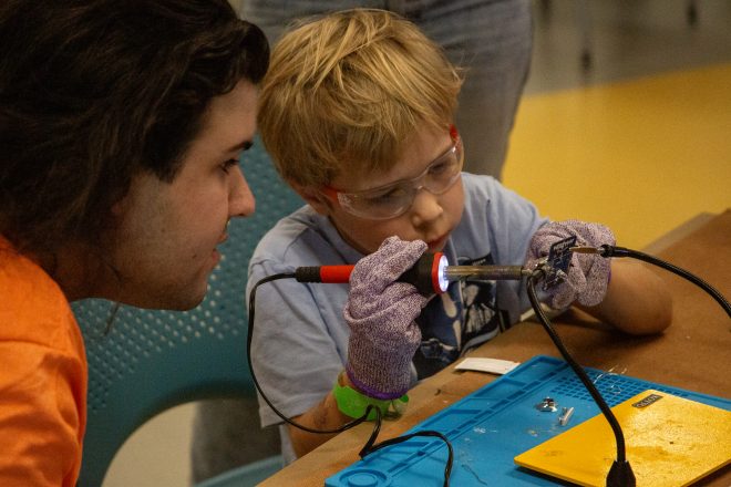 Taking apart a car. Operating power tools. Soldering leads. Sawing and hammering lumber. We typically associate these activities with the broad-shouldered and rough-handed; but at the Scott Family Amazeum Tinkerfest this weekend, these were just a few of the activities kids of all ages participated in.