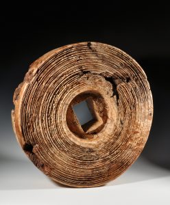 Included in the September Exhibit is Robyn Horn’s sculpture “Ancient Millstone”, which is inspired by the forms used in early farming to grind grain. The millstone concept has been a recurring theme in Horn’s contemporary wood sculptures that balance geometric form with organic elements. Her work has been collected and exhibited by museums and galleries throughout the nation and abroad. Public collections include: The National Museum of American Art, Renwick Gallery,Washington,D.C.; Museum of Arts and Design, New York, NY; Victoria and Albert Museum, London, England; Museum of Fine Arts, Boston, MA; Museum of Fine Arts, Houston, TX; White House Collection of American Crafts, Clinton Library, Little Rock, AR; Arkansas Museum of Fine Art, Little Rock, AR; Fuller Craft Museum, Brockton, MA; Arizona State University, Tempe, AZ; Long Beach Museum of Art, Long Beach, CA; Los Angeles County Museum of Art, Los Angeles, CA; Minneapolis Institute of Arts, Minneapolis, MN; Mobile Museum of Art, Mobile, AL; The Center for Art in Wood, Philadelphia, PA; Yale University Art Gallery, New Haven, CT; Ogden Museum of Southern Art, New Orleans, LA; North Carolina State University, Gregg Museum of Art & Design, Raleigh, NC; Mint Museum of Craft & Design, Charlotte, NC; Detroit Institute of Art, Detroit, MI; Arrowmont School of Arts & Crafts, Gatlinburg,TN; and many others.