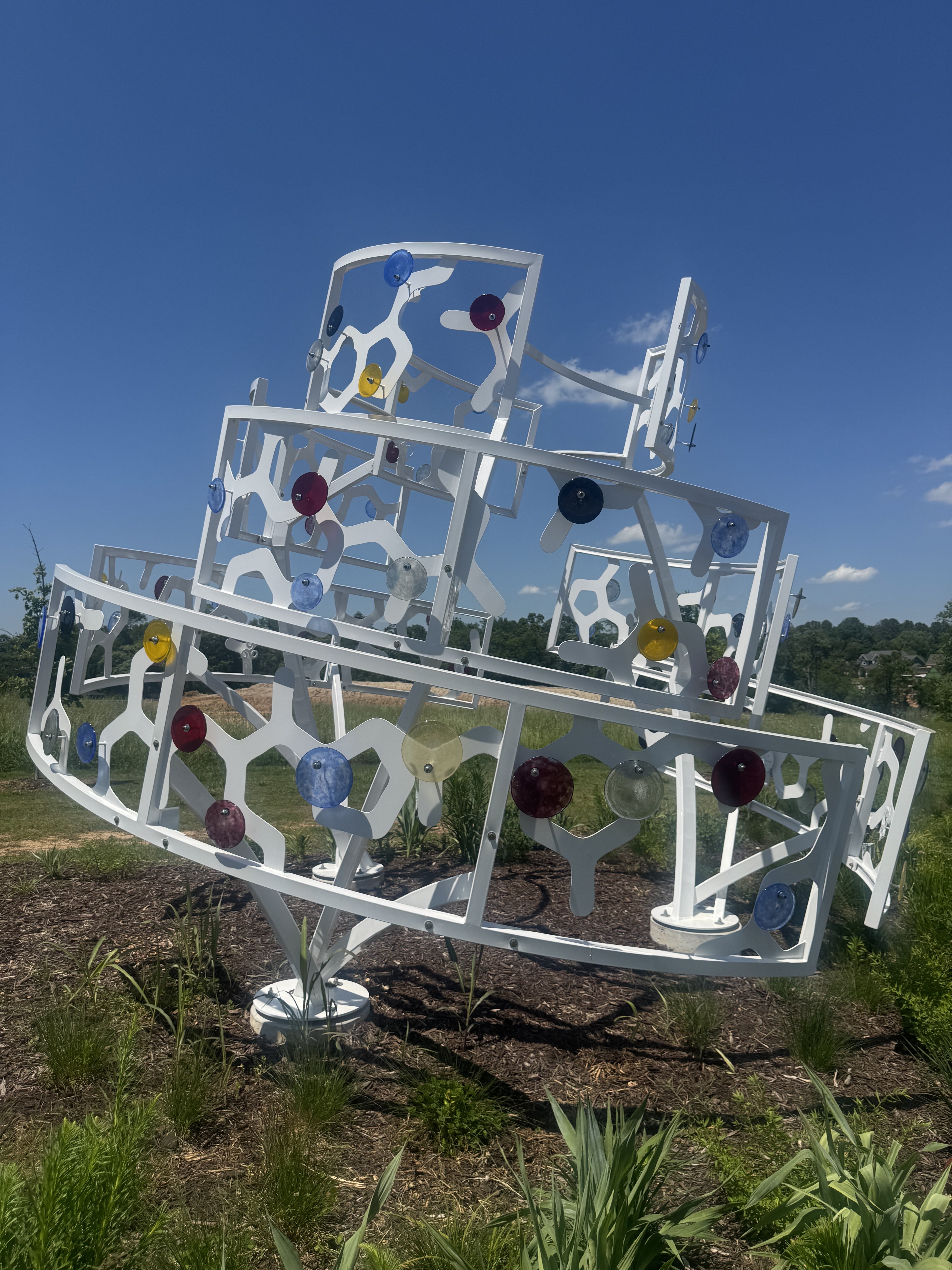 “Love Chemical” is a tactile-safe, outdoor sculpture that features a series of curved layered panels allowing viewers to be surrounded, seemingly embraced, when in the middle of work.