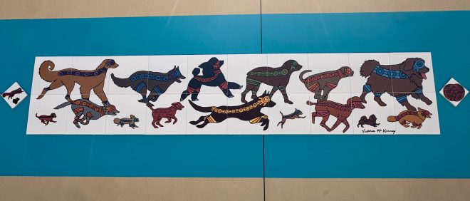 The final artwork, artist Victoria McKinney’s Tribal Dogs, is a 66 sq. ft. mural featuring tribal dogs and other animals inspired by Mound Builder motifs.