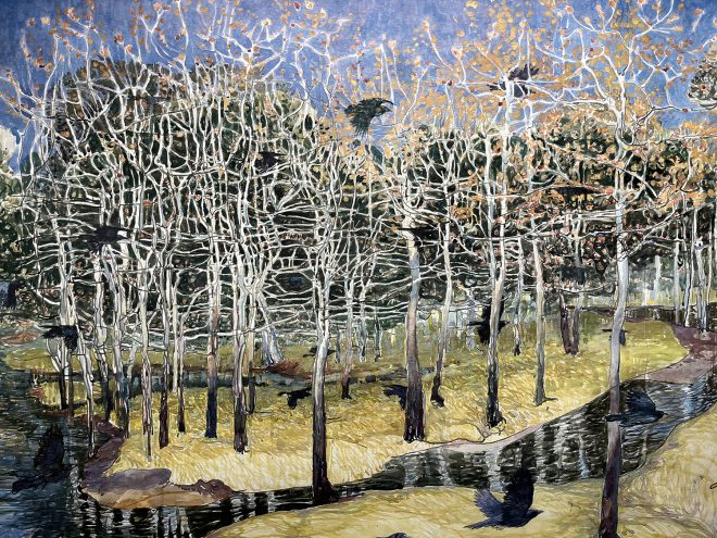 Image: “Crows Through a Glade” by Mark Blaney (c) – 26”h x 36”w – watercolor and conté on paper