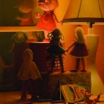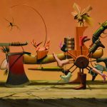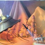 With a lack of brush strokes, Cassity’s works in their final forms have become unique and wildly recognizable. “The Kingdom,” his most identifiable series, was inspired by his wife’s son, who folded an origami dragon from a hamburger wrapper. The origami dragon was eventually placed on a pine board along with two matchsticks and a wine bottle, leading to the creation of “Torches, Tower, and Dragon,” the first painting created for “The Kingdom.”